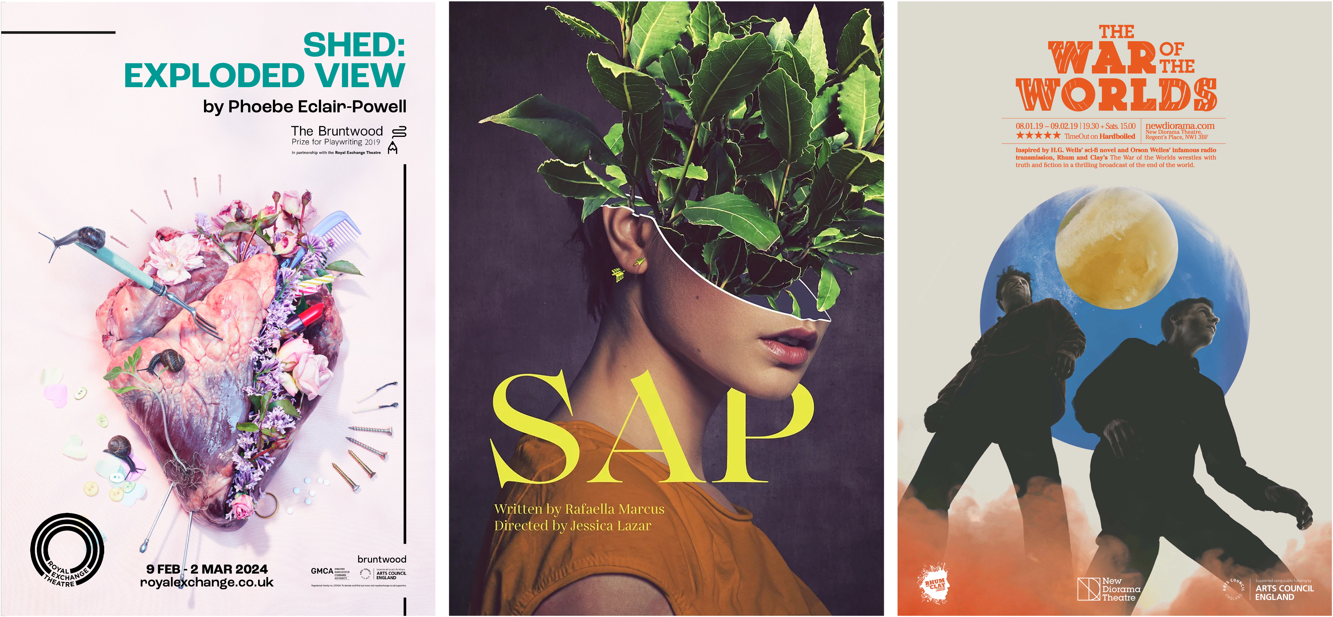 One of the posters that made me want to write about this topic at all was Felicity McCabe’s for Shed: Exploded View at the Royal Exchange. Her creepy-doll-face poster for John and defiant-young-women Crucible posters, both for the NT, are also great. But it is Shed which, for me, does all the things I think a theatre poster should: it immediately grabs attention, with its combination of pastel prettiness and disturbing imagery; it intrigues, being both beautiful and horrible (what is a fork doing in a heart? What is the tone here?) And once I’d seen the show, it also worked as a representation of the fragmentary form of the play, its inspiration, and its content – reflecting this story about love and about violence. Plus, it looks just as good blown up massive on the side of a building or on a small square on your phone screen.