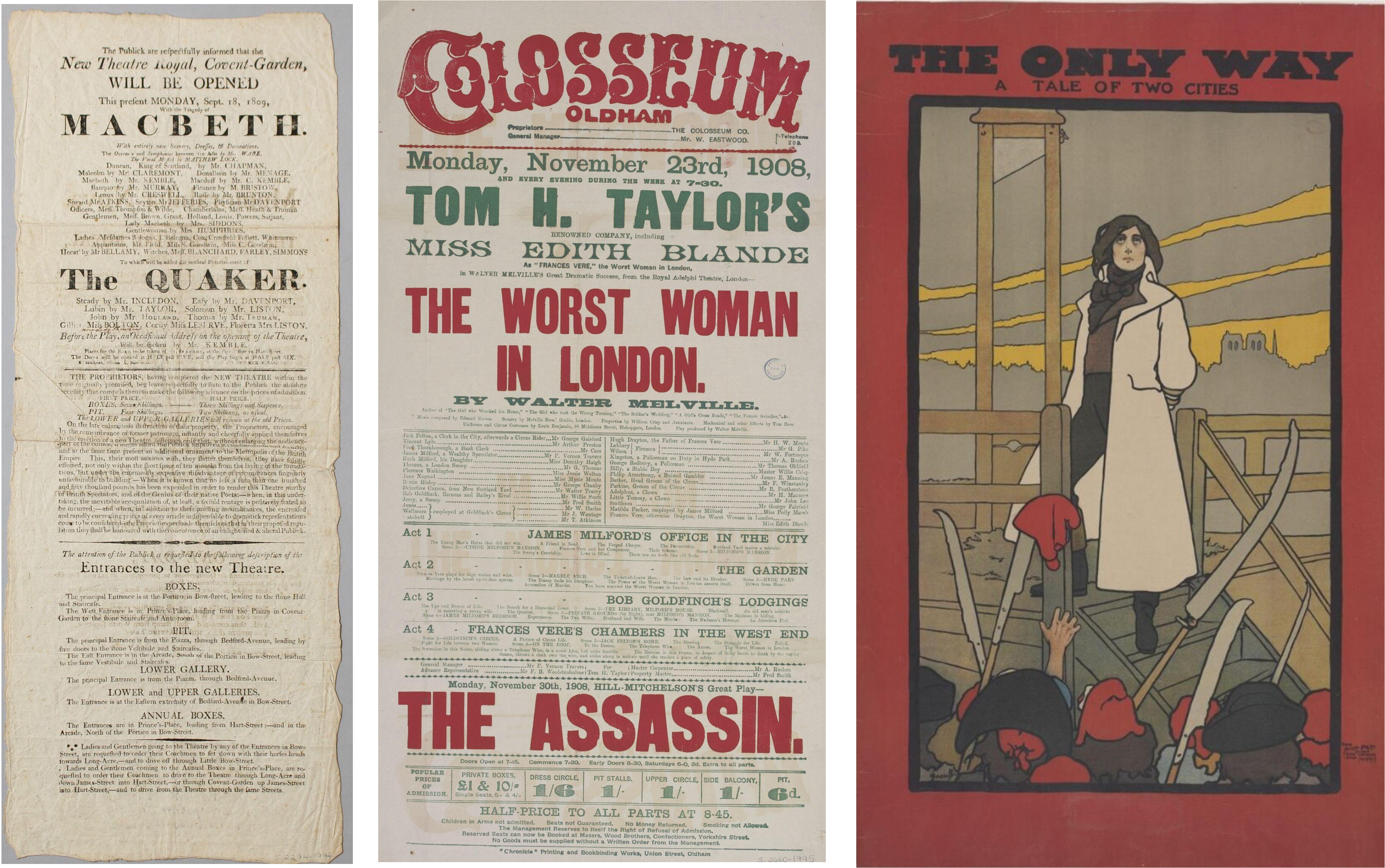 Our minds may leap to the world of charming vintage illustrations – but it’s not all stylised circus performers or women in big frocks. Pritchard points to the haunting illustration in The Only Way, from 1899 – an adaptation of A Tale of Two Cities that advertised itself with a picture of the guillotine. As a depiction of the French Revolution, she points out drily, “it’s a real contrast to Les Mis…”